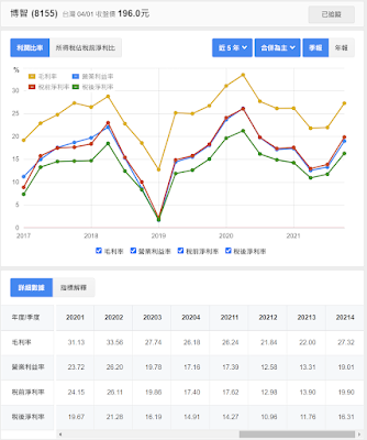 由每季損益表中,可以發現普萊德(6263) 是一家表現很穩定的公司,近五年來每季的毛利率、營業利益率、稅前淨利率都相當的穩定,甚至緩慢往上成長。 從博智(8155)可以發現近五年來,損益上有些許波動,不過從2021年初谷底之後,毛利率等指標又開始緩步往上爬升。